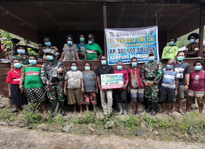 Untuk menjaga ketertiban dalam rangka pembagian dana BLT dan melaksanakan penegakan protokol kesehatan untuk mencegah penyebaran virus covid-19, Aparat Kampung Beanekogom Tsinga melalui Kepala Kampung meminta bantuan Satgas pamrahwan Yonif 756/WMS pos Tsinga yang berada dibawah Kolakops Korem 174/ATW untuk melakukan monitoring dan Pengamanan Pembagian Dana BLT, Rabu(30/12/2020).